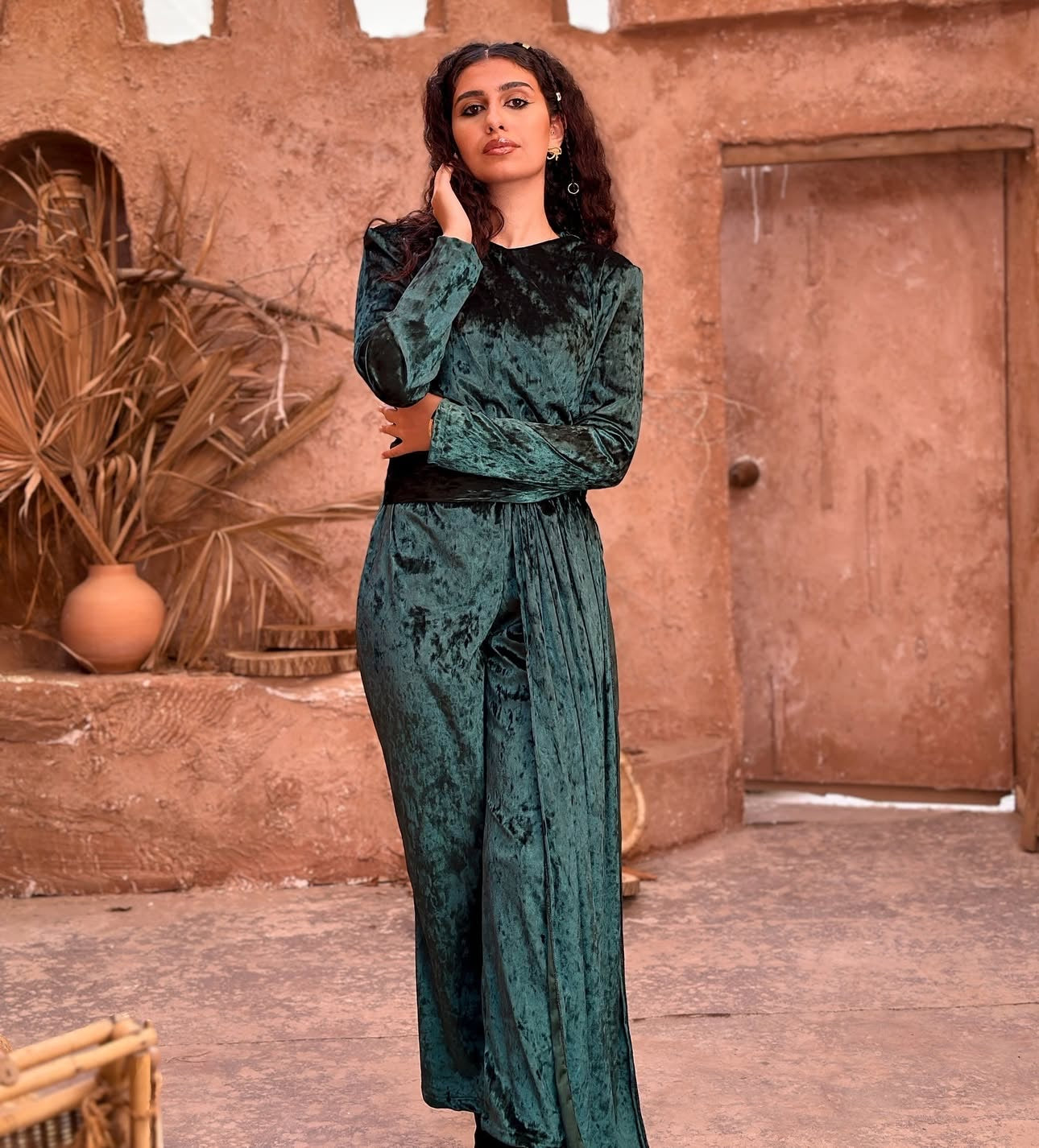 Designed in rich velvet with a fluid silhouette, it moves with grace while holding its structure — creating a look that feels powerful yet understated.